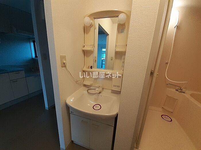 忙しい朝でも鏡を見ながらサッと身支度を整えられる独立洗面台があります。バルコニー付きの物件です。