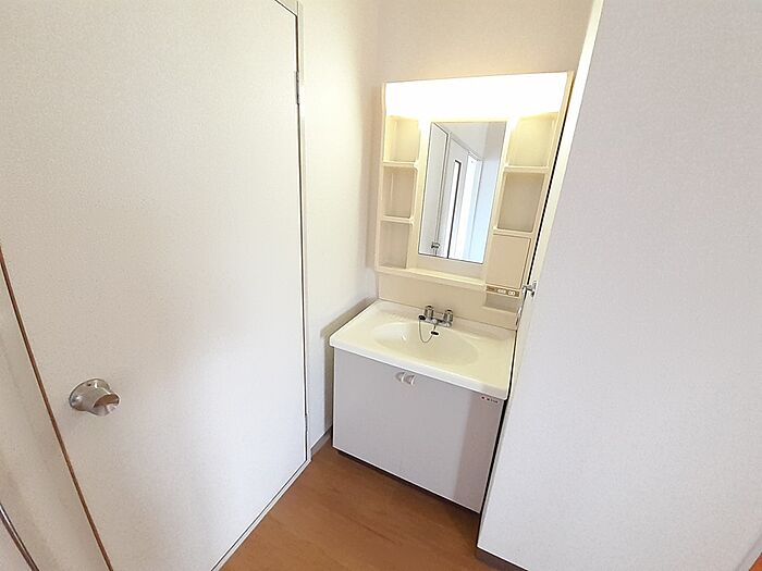忙しい朝でも鏡を見ながらサッと身支度を整えることができる洗面化粧台があります。