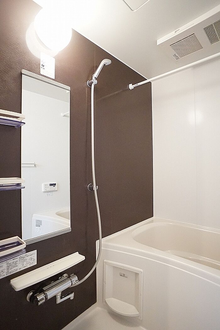 追い焚き機能、浴室乾燥機付きのお風呂場です。洗面所は使いやすい独立タイプです。都市ガス物件です。