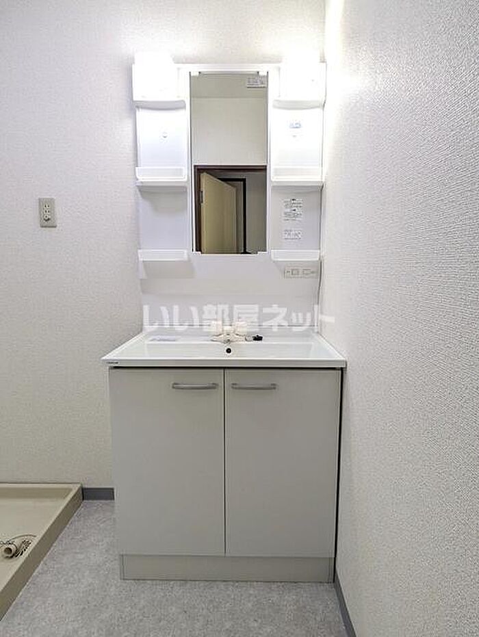 収納スペースが大きいため、生活感のでやすい小物類もすっきりと隠して収納できる洗面化粧台があります。