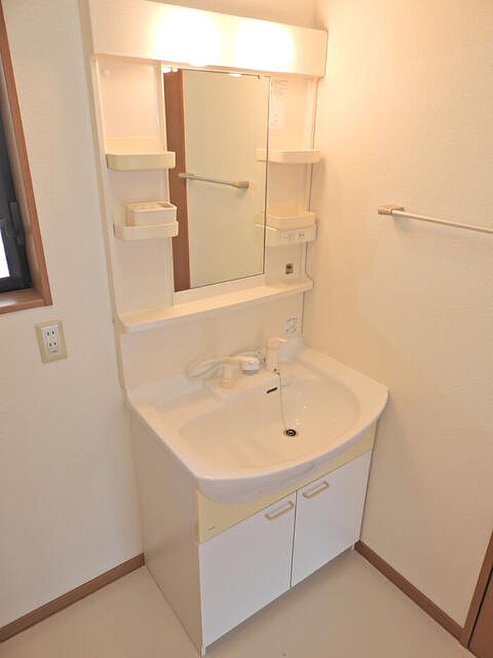 身支度に必要となる様々なアイテムを収納可能なスペースがある独立洗面台が付いています。