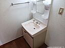 蛇口や洗面器が鏡が一緒になって大変使い勝手が良いのが洗面化粧台です。駐輪場付きの物件です。