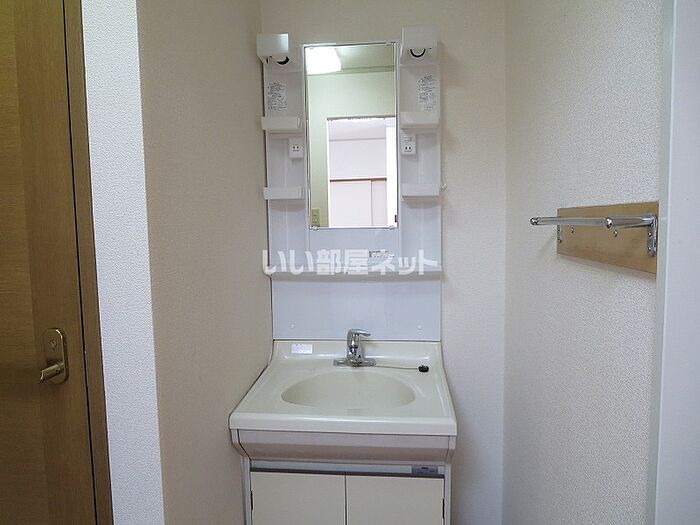 化粧品や洗面道具といった小物をまとめてスッキリ収納できる洗面化粧台が付いております。