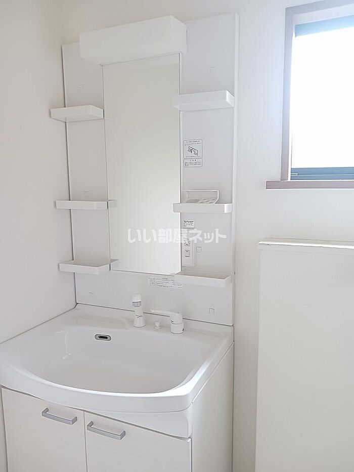 化粧品やスタイリング剤などをまとめて出し入れして、サッと身支度を整えられる独立洗面台があります。