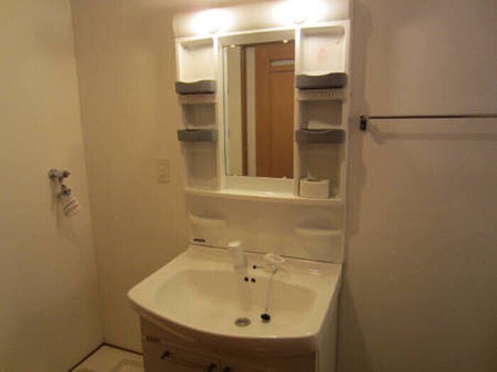 化粧品や洗面道具といった小物をまとめて収納できる独立洗面台を採用しています。