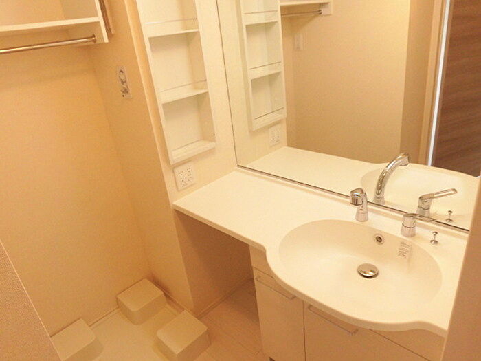 身支度に必要となる様々なアイテムを収納可能なスペースがある独立洗面台が付いています。