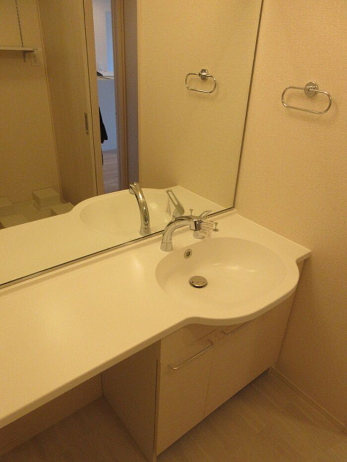 化粧品や洗面道具といった小物をまとめて収納できる独立洗面台を採用しています。
