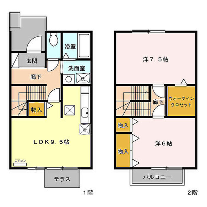 インターネット無料(DU-NET)、エアコン1台、温水洗浄暖房便座、洗髪洗面化粧台、モニタ付インターホン、追い焚き給湯付きのメゾネットタイプ2LDK