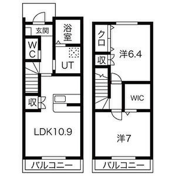 LDK10.9(1階) × 1 、洋7(2階) × 1/ 洋6.4(2階) × 1)