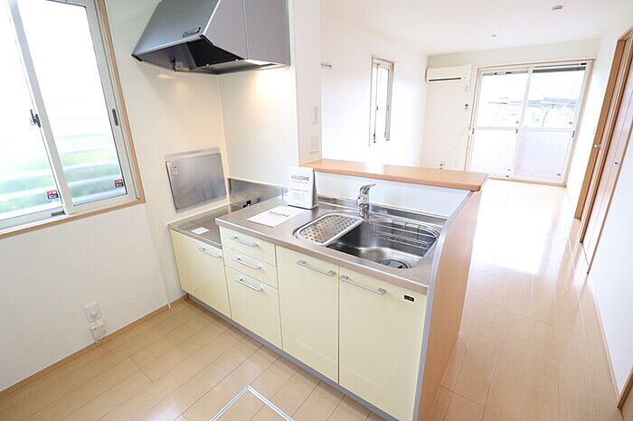 対面カウンターキッチン・エアコン・モニタ付インターホン・温水洗浄暖房便座・室内物干しなどが付いてます。駐車場2台付きです・3台目3、300円(3台目区画の空き状況はお問い合わせ下さい)