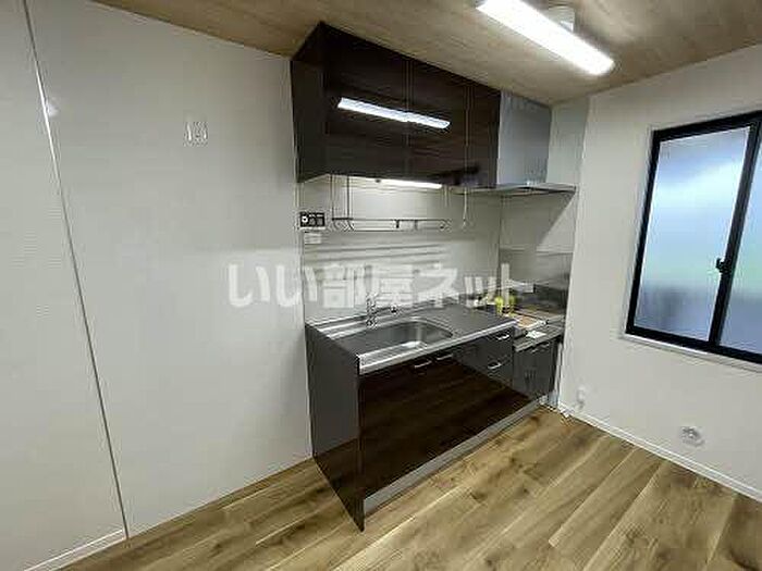 朝の整髪が効率よくなる洗面化粧台が備え付けられています。引越し当日から夜も明るい照明付きのお部屋。