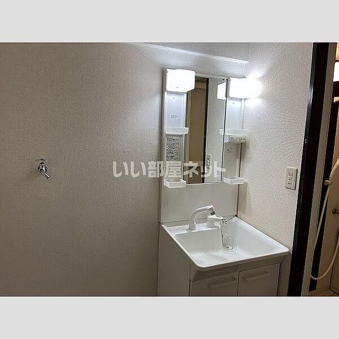 化粧品や洗面道具といった小物もスッキリまとめて収納できる独立洗面台があります。