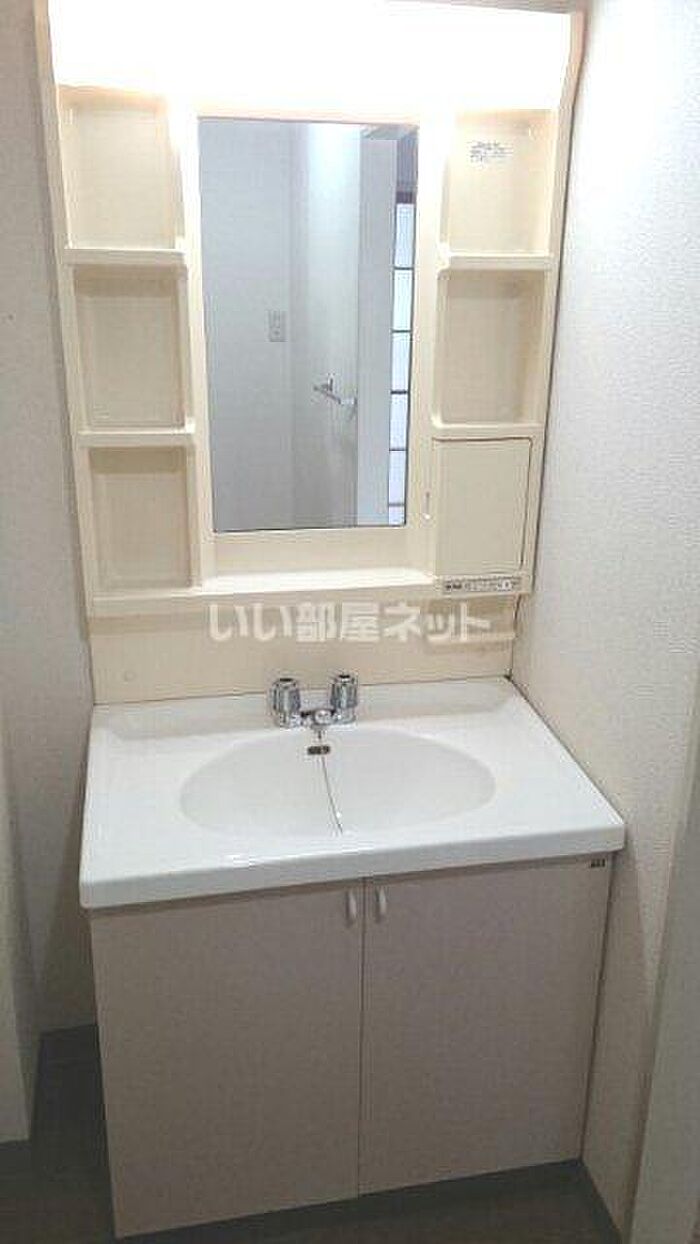 独立洗面台なので床が水で濡れたり鏡が曇ったりしにくく、清潔な状態を保ちやすくなっております。