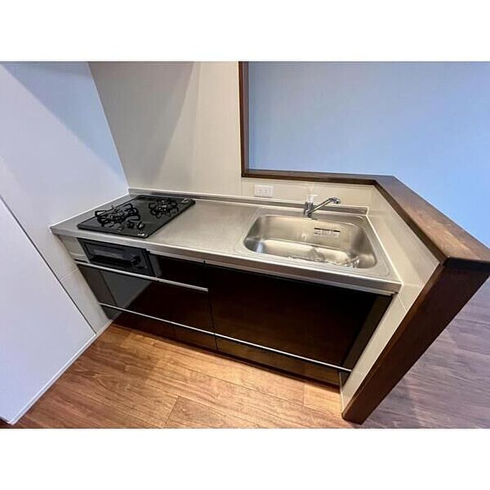 お財布に優しい都市ガス。3口コンロのシステムキッチン採用なので自炊もばっちり。