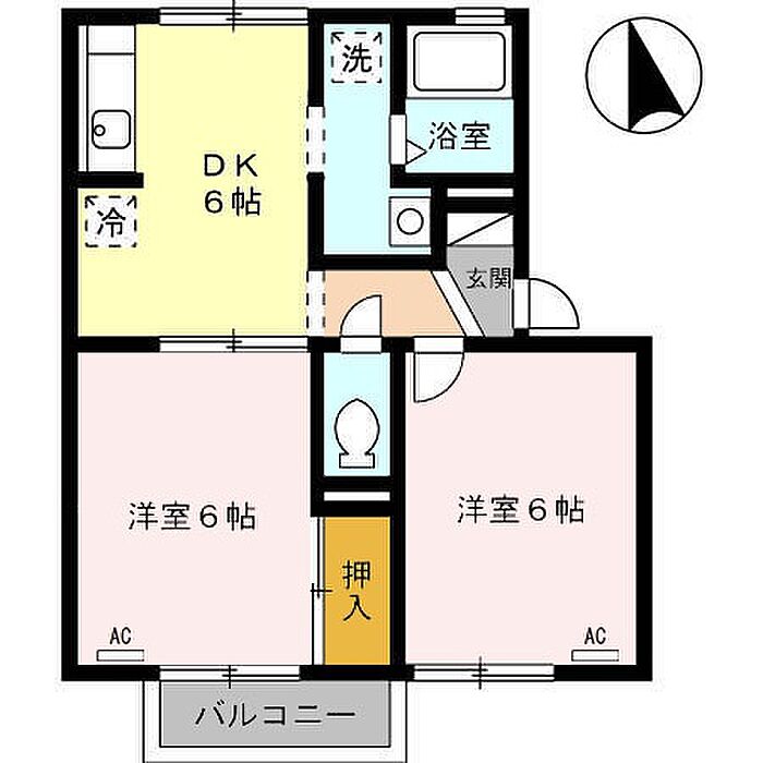 1階2DKのお部屋です。専用庭は開放感があります。エアコン付。