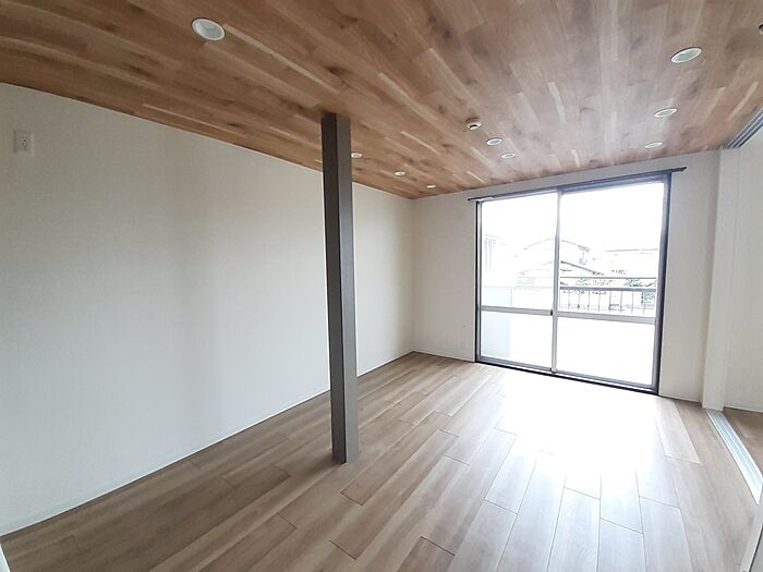 やさしい木目調の天井にダウンライト付きのリビング、システムキッチン。Wi−Fiネット無料付き。
