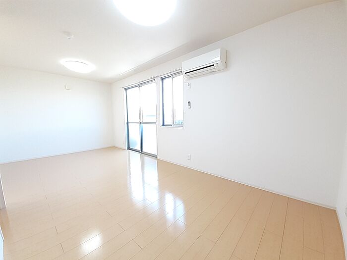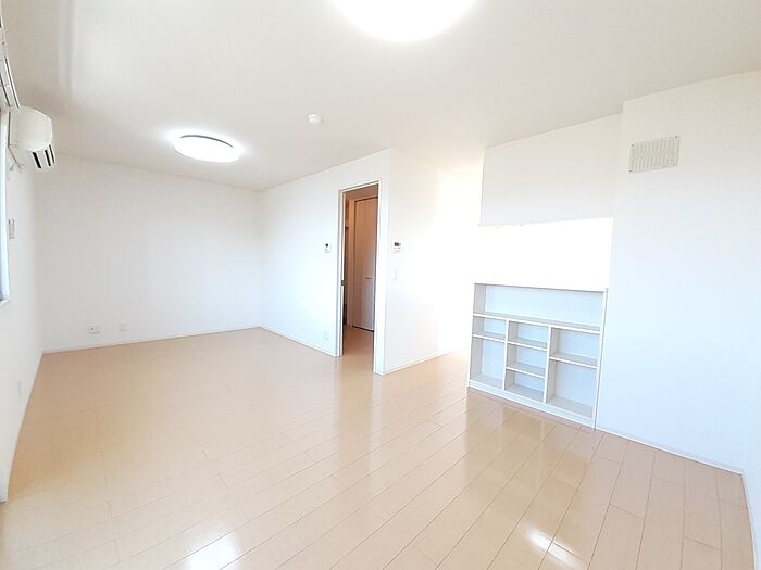 オートロック、エアコン2台、照明付き。対面キッチン付き14.5帖リビング、追焚き付き1坪バスです