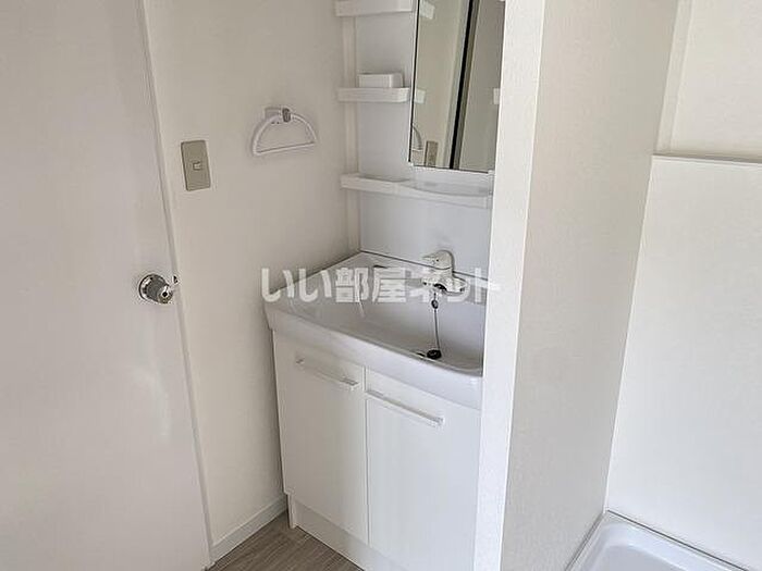 化粧品や洗面道具といった小物をまとめて収納できる洗面化粧台が付いております。1LDKの物件です。