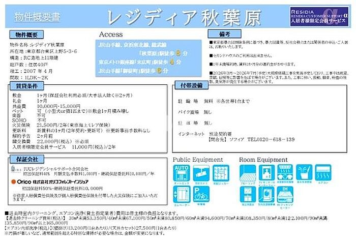 保証会社利用料:IUCレジデンシャルサポート 初回契約時:40%、更新時:10,000円、月額:1,000円、※保証会社の更新は1年毎となります