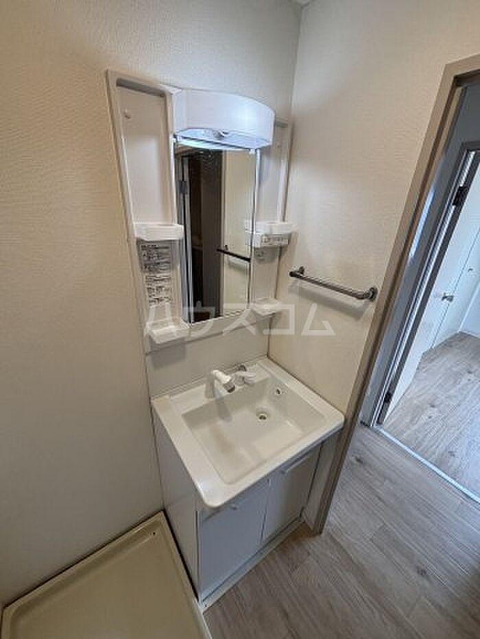 化粧品やスタイリング剤などをまとめて出して、サッと身支度を整えられる独立洗面台があります。