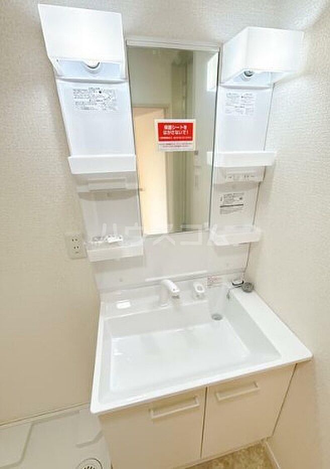 身支度に必要となる様々なアイテムを収納可能なスペースがある独立洗面台が付いています。
