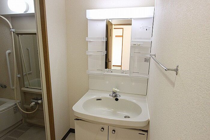化粧品や洗面道具といった小物もスッキリまとめて収納できる独立洗面台が付いております。