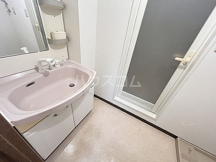 収納スペースのある洗面化粧台は、とても利便性が高いです。バルコニー付きの物件です。