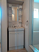 髪のセットがやりやすい洗面化粧台が設置されております。バルコニー付きのアパートです。