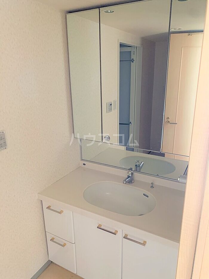 化粧品や洗面道具といった小物もスッキリまとめて収納できる独立洗面台が付いております。