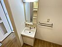 化粧品や洗面道具といった小物をまとめて収納できる独立洗面台があります。こちらの物件はアパートです。