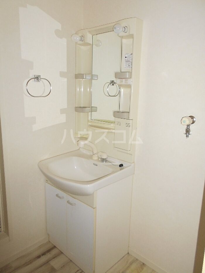 化粧品や洗面道具といった小物をまとめて収納できる独立洗面台が付いております。