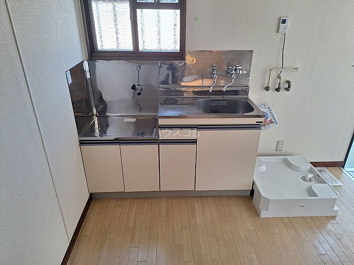 二口コンロなので料理もはかどるキッチンです。軽量鉄骨を使用しているので、地震対策にもつながります。