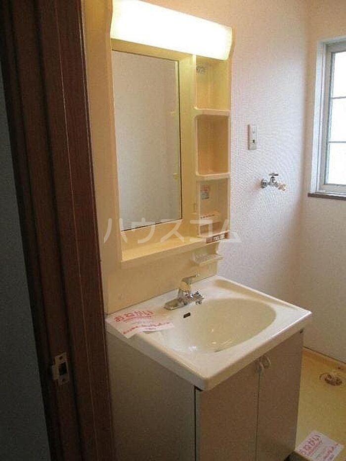 化粧品や洗面道具といった小物をまとめて収納できる独立洗面台が付いております。