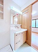 独立洗面台なので床が水で濡れたり鏡が曇ったりしにくく、清潔な状態を保ちやすくなっております。