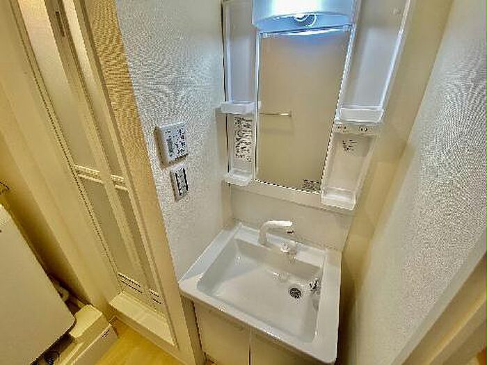 化粧品や洗面道具といった小物をまとめて収納できる独立洗面台があります。バルコニー付きの物件です。