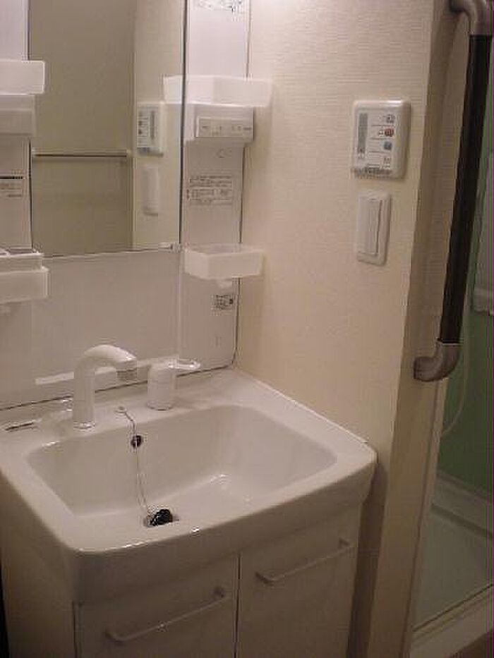 化粧品や洗面道具といった小物をまとめて収納できる独立洗面台が付いております。