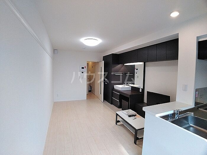 化粧水や化粧品なども片付けられるのが洗面化粧台のメリットです。電気コンロをご利用いただける物件です。