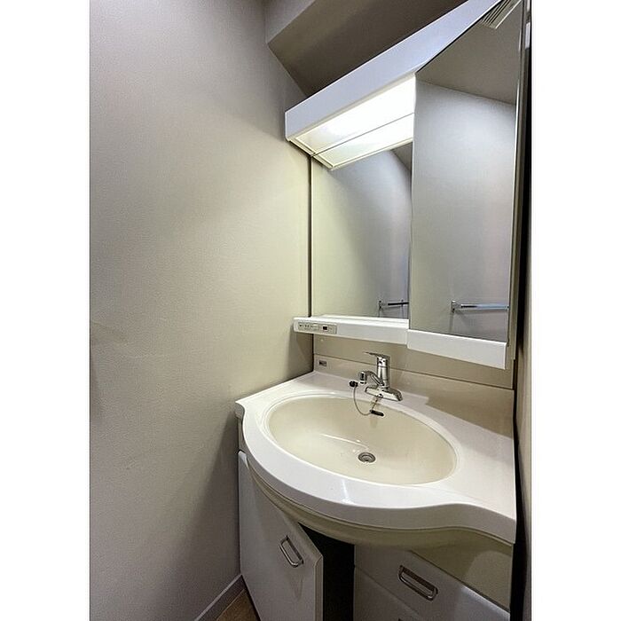 化粧品やスタイリング剤などをまとめて出し入れして、サッと身支度を整えられる独立洗面台があります。