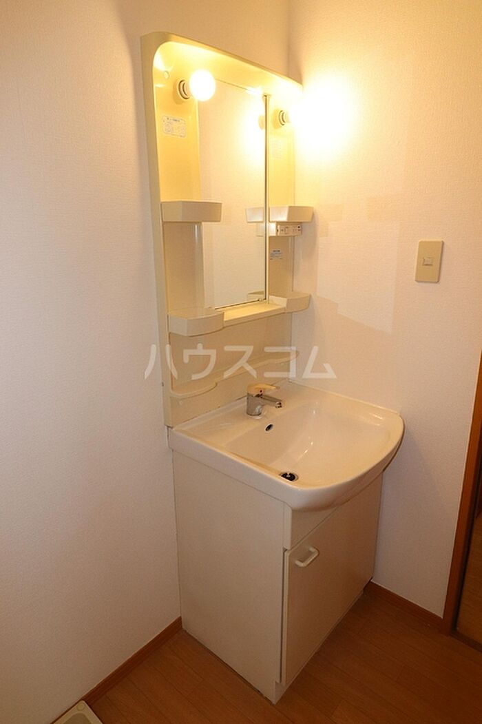 化粧をするスペースのある洗面化粧台付きの物件です。子供がいらっしゃるご家庭でもご契約可能な物件です。