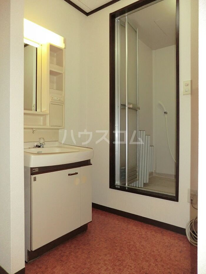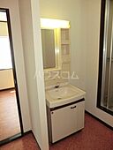化粧品や洗面道具といった小物をまとめて収納できる洗面化粧台があります。こちらの物件はアパートです。