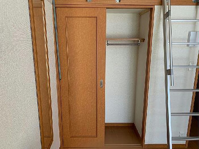 洋服や日用品をまとめて収納できる収納棚がついた物件です。こちらの物件はアパートです。
