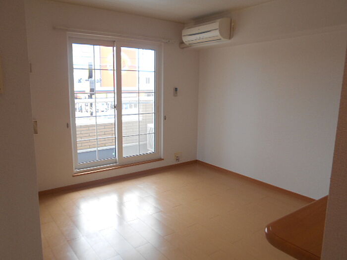 フローリング張りのお部屋です。快適に生活する上で欠かせないエアコンが設置されている物件です。
