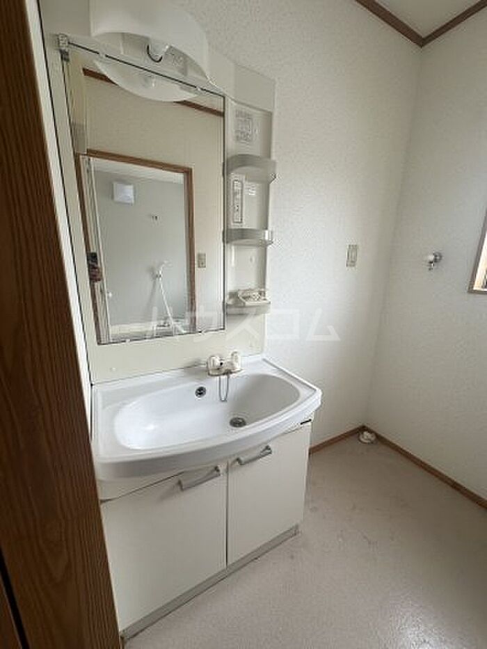 化粧品や洗面道具といった小物をまとめて収納できる独立洗面台があります。法人様向け物件です。