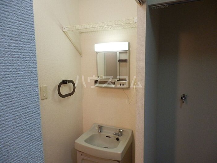 化粧品や洗面道具といった小物をまとめて収納できる独立洗面台が付いております。