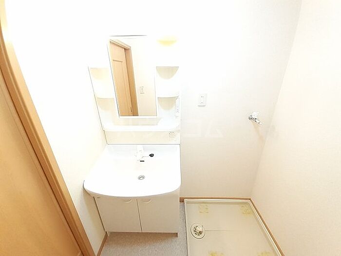 収納力が高い、洗面化粧台のある物件です。こちらの物件はマンションです。