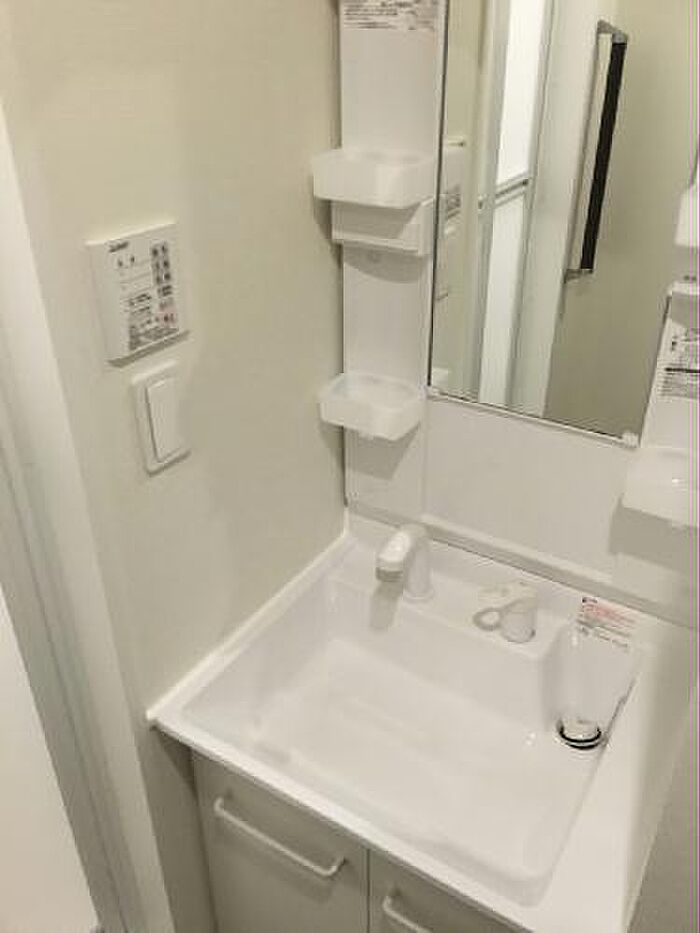 化粧品や洗面道具といった小物もスッキリまとめて収納できる独立洗面台があります。
