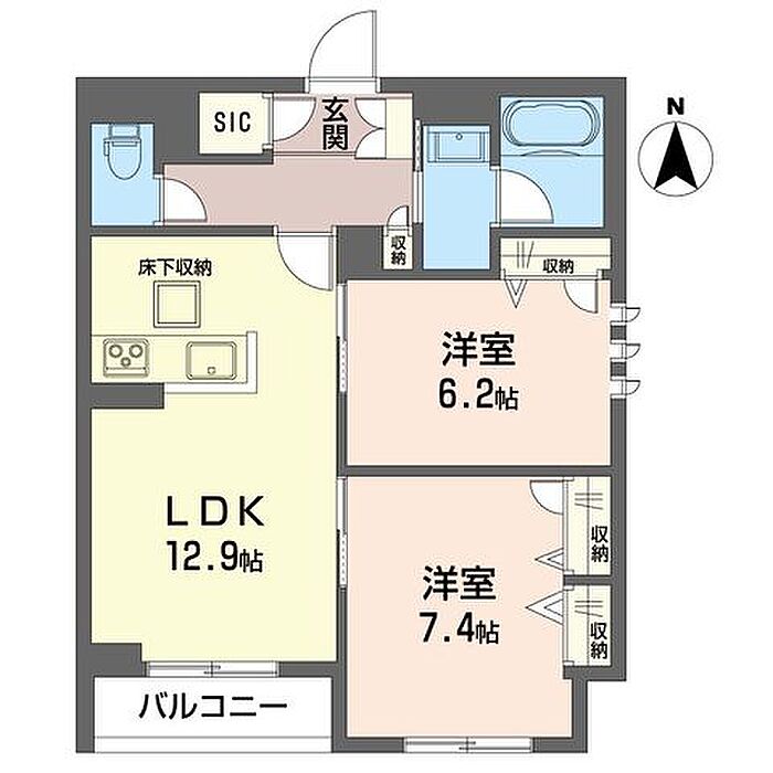洋室7.4 洋室6.2 LDK12.9 ※1畳=1.62m2)