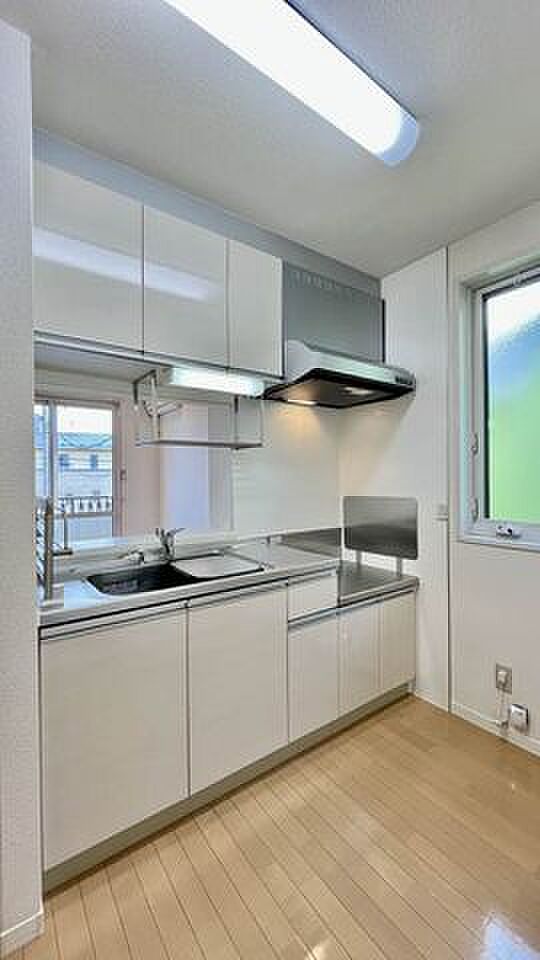 全戸角部屋の2LDKです。カウンターキッチンタイプです。追焚機能付給湯器・カラーモニター付ドアホン