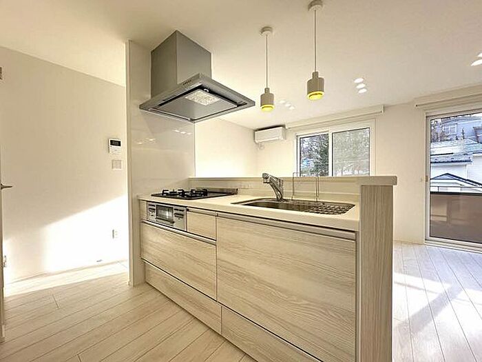 間取改装(2LDK→1LDK)、ユニットバス交換、洗面化粧台交換、ウォークスルークローゼット、システムキッチン(ビルトインガスコンロ3口付き)、トイレ交換、ダウンライト