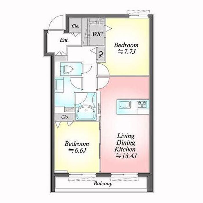 洋室6.6 洋室7.7 LDK13.4 ※1畳=1.62m2)